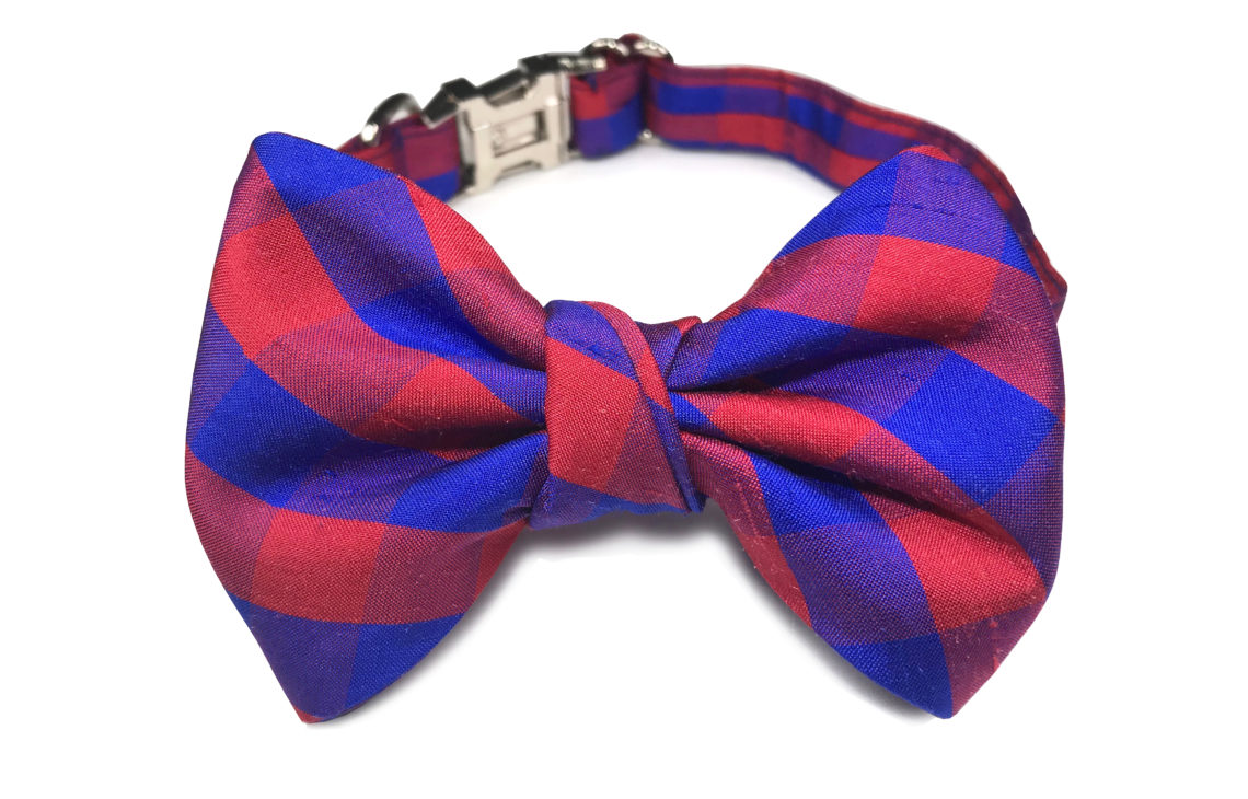 Crisp silk taffeta gingham in brilliant blue and red. Fabric of France. Self-tie bow tie and matching pet bow tie collar can be worn together with your beloved pet, creating the most joyful memories and making it an ideal gift.
