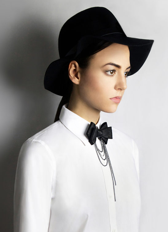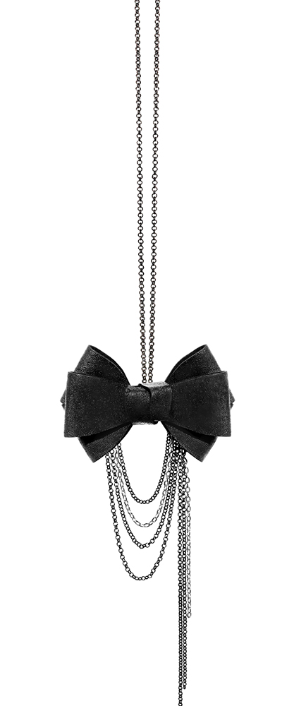 A cutting edge sculpted and layered leather bow tie with center twist. Draped chains in various gunmetal and silver. Gunmetal chain necklace, adjustable and detachable. This bow tie necklace can be worn close to the neck, or as a necklace in desired length. The bow without the chain can be clipped on anything – a top, shirt, jacket, or a hat. The comes packaged in a white gift box.