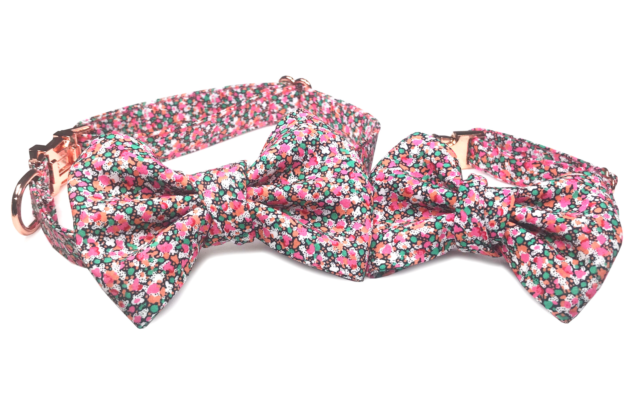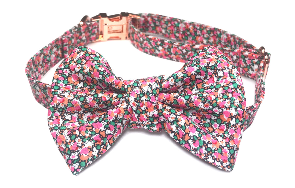 Pet bow tie comes in sizes small and medium, and medium is also designed to fit women and children, and a pre-tied children’s bow tie is also available. The pet bow slides to any position on the collar and can be placed on the front, side, or back of the neck. Hardware consists of logo engraved stainless steel buckle, D ring for a leash, and slider for size adjustment.