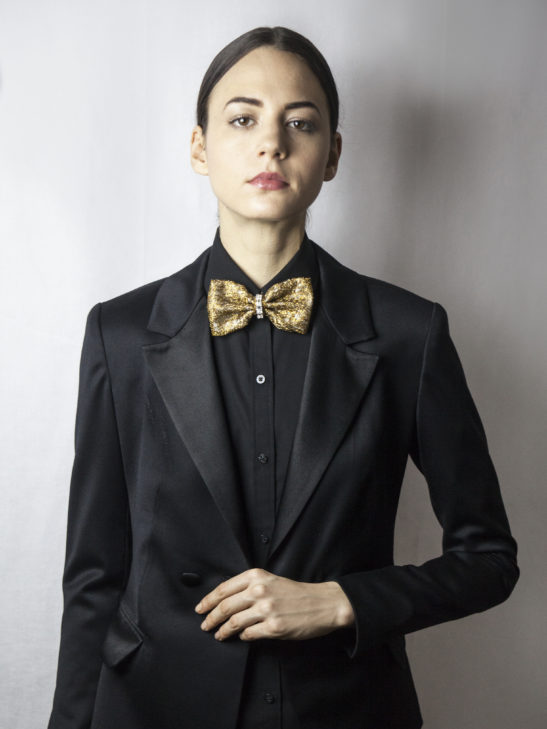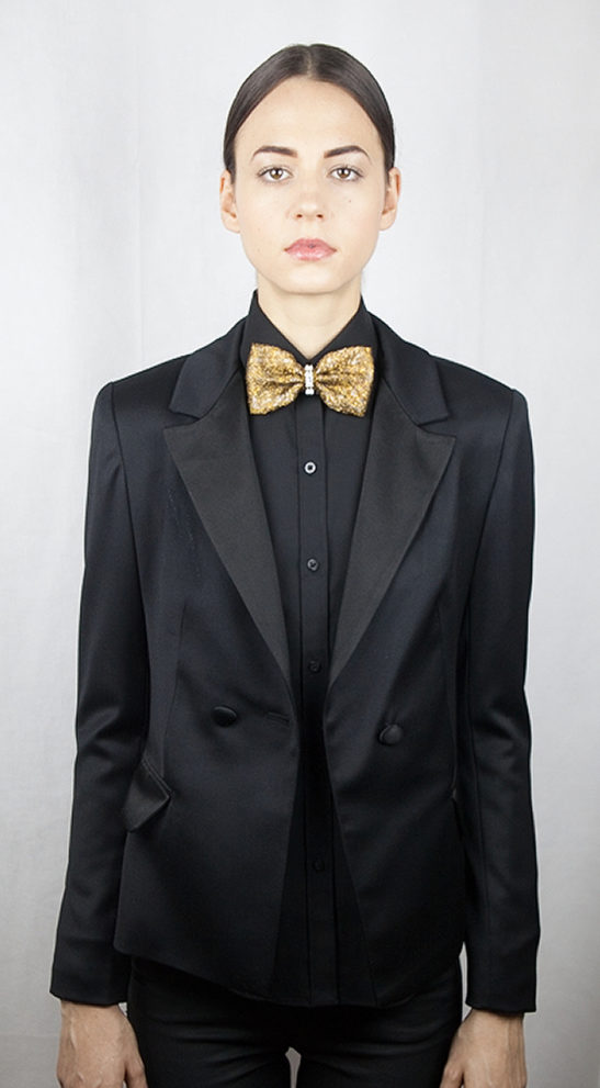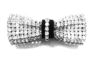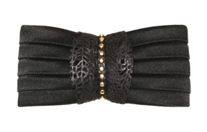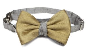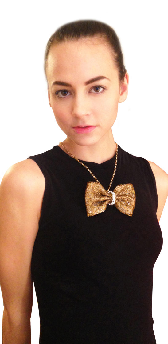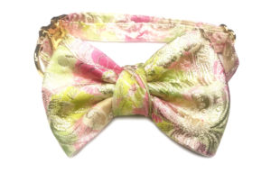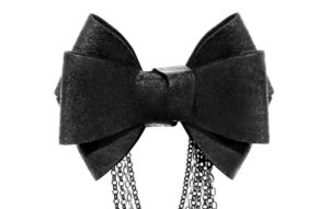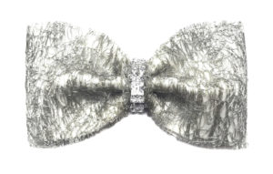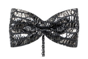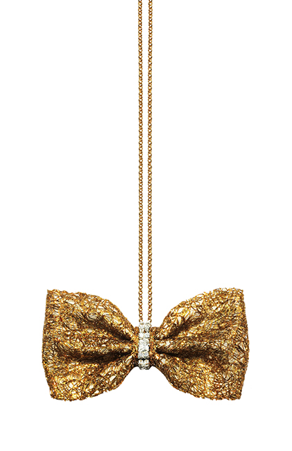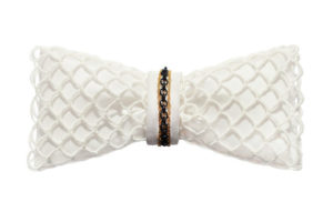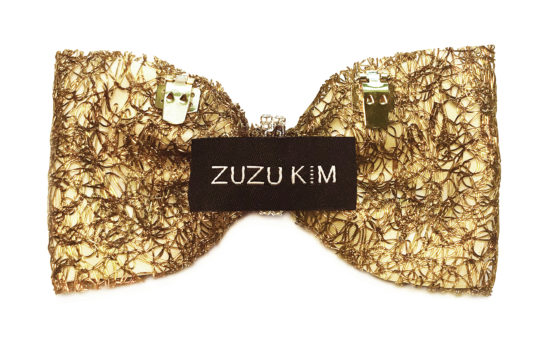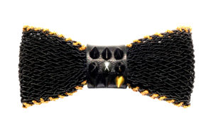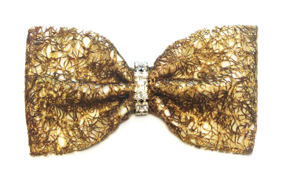 A state-of-the-art couture bow tie. Deep gold polyurethane mesh with ivory satin faced organza silk under layer. Gold chain necklace, adjustable and detachable. This bow tie necklace can be worn close to the neck, or as a necklace in desired length. The bow without the chain can be clipped on anything – a top, shirt, jacket, or a hat. Mesh and clips, made in France. It comes packaged in a white gift box.