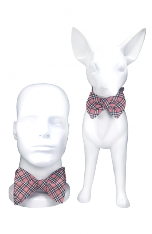 Pet bow tie comes in sizes small and medium, and medium is also designed to fit women and children, and a pre-tied children’s bow tie is also available. The pet bow slides to any position on the collar and can be placed on the front, side, or back of the neck. Hardware consists of logo engraved stainless steel buckle, D ring for a leash, and slider for size adjustment.