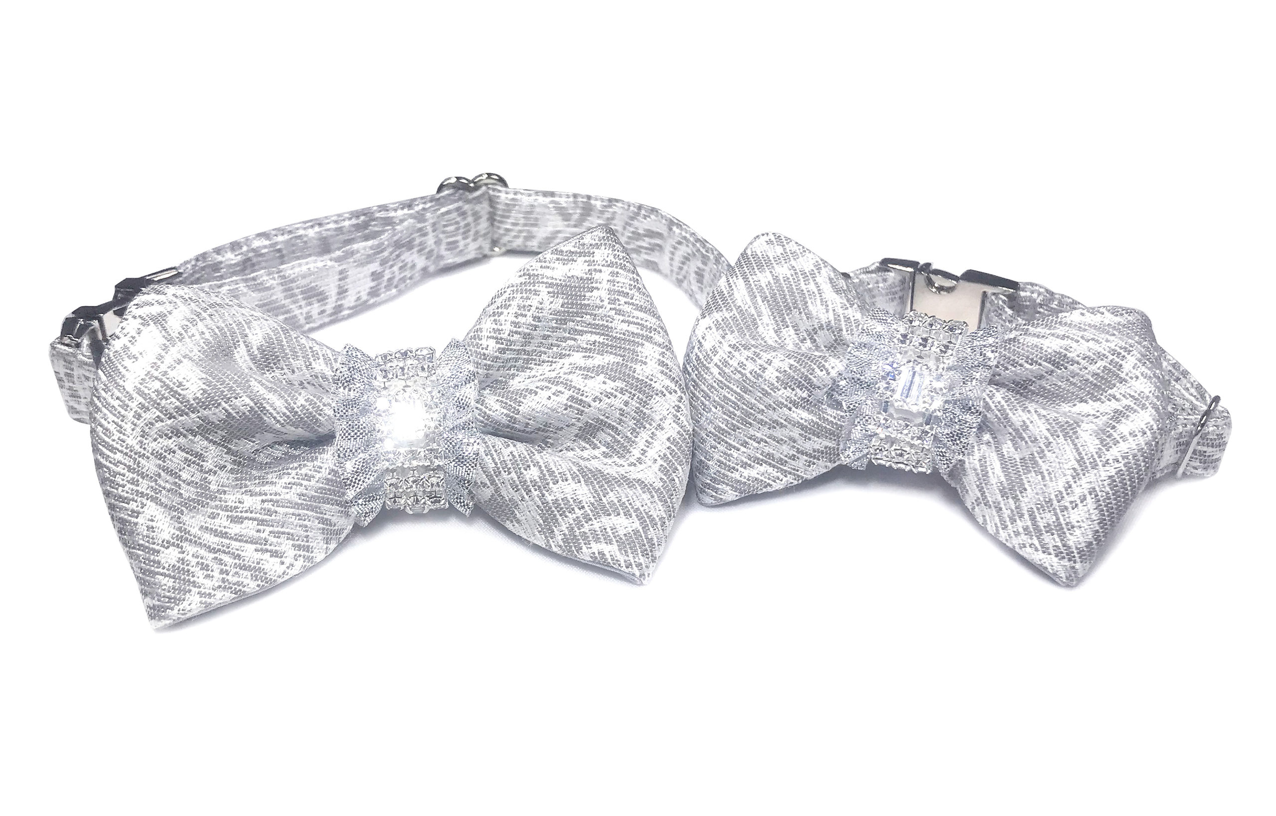 Opulent silver and grey silk brocade, fabric of France. Silver ruffles at center with crystals made in Czech Republic. This handmade and adjustable bow tie collar comes in small and medium for cats and dogs of all sizes. The medium bow tie collar is also designed for women and can be worn as a matching pet collar to wear together with your loving pet – both make an ideal gift, and create the most joyful and unforgettable memories.